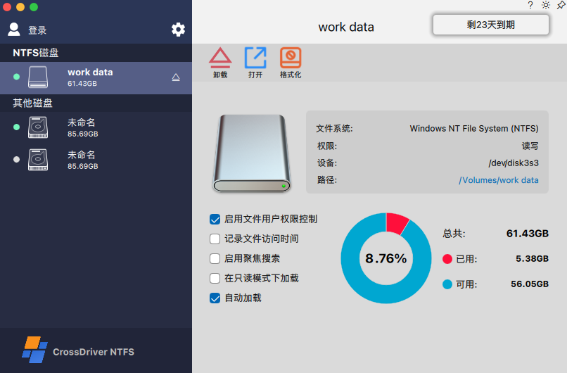 | 磁盘管理 | CrossDriver NTFSforMac 挂载程序在启动时自动以读写模式挂载 WindowS NTFS 格式的驱动器。 |